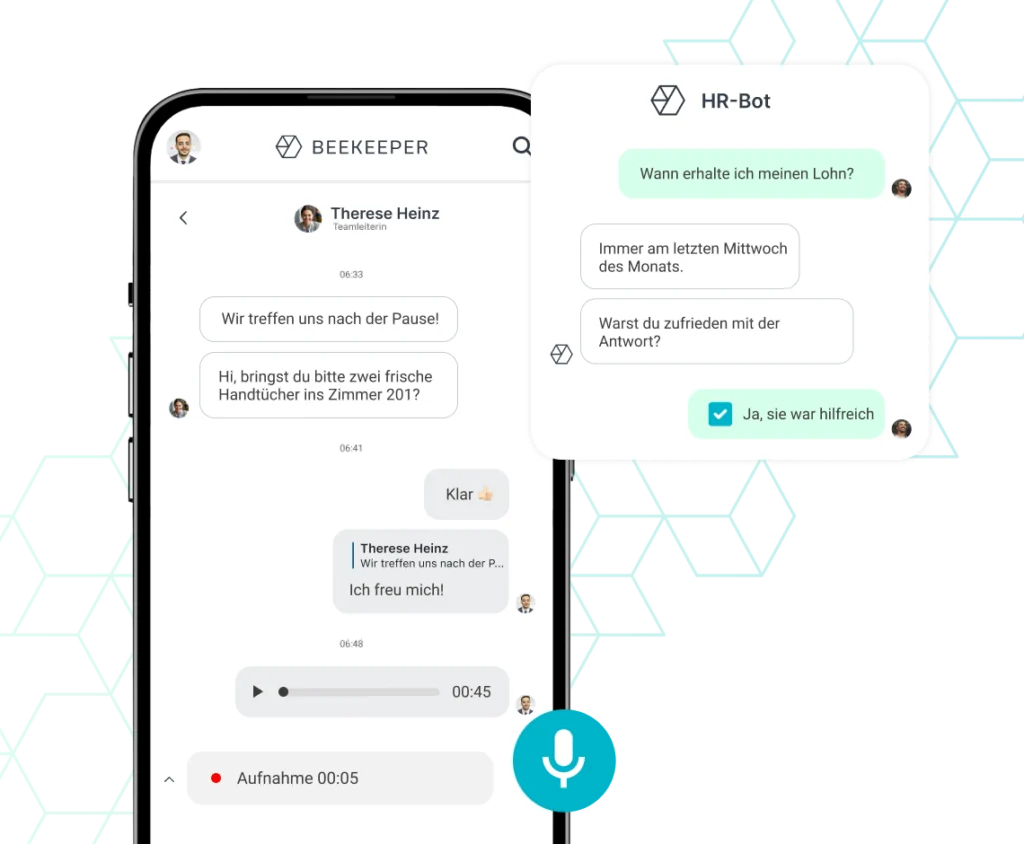 In der Beekeeper-App können Ihre Mitarbeitenden in Gruppen- und Einzelchats außerdem Sprachnachrichten versenden. Zusätzlich beantwortet ein FAQ-Chatbot die am häufigst gestellten Fragen automatisiert.