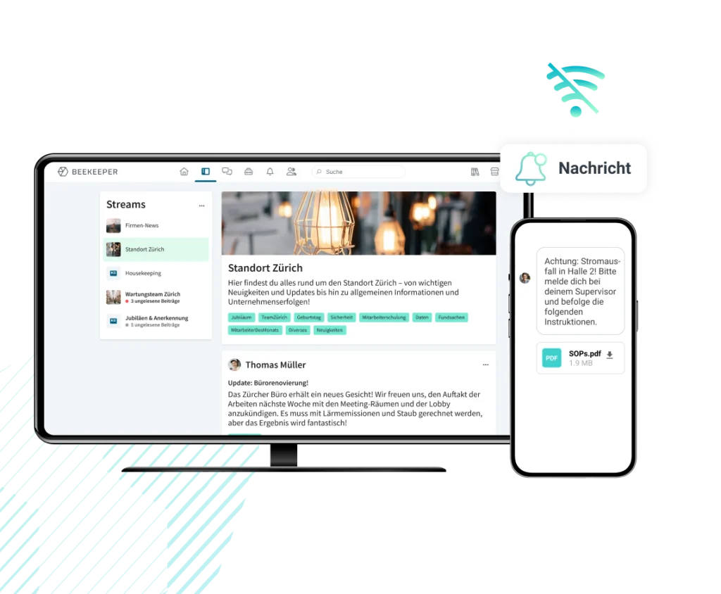 Mit Beekeeper teilen Sie wichtige Updates und bieten per Self-Service Zugriff auf eine Dokumentenbibliothek. So bleiben alle Mitarbeitenden auf dem neuesten Stand.