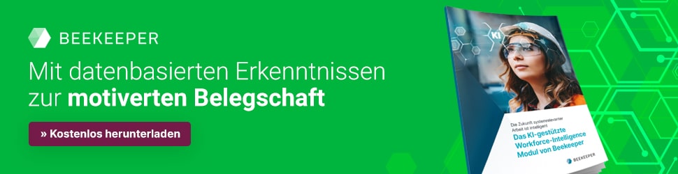Die KI von Beekeeper ist speziell dafür entwickelt, verschiedenste Themen von Arbeitszufriedenheit bis Leistungsbewertung abzudecken. So können Sie Ihre Belegschaft umfassend betreuen und ihr Engagement positiv beeinflussen.