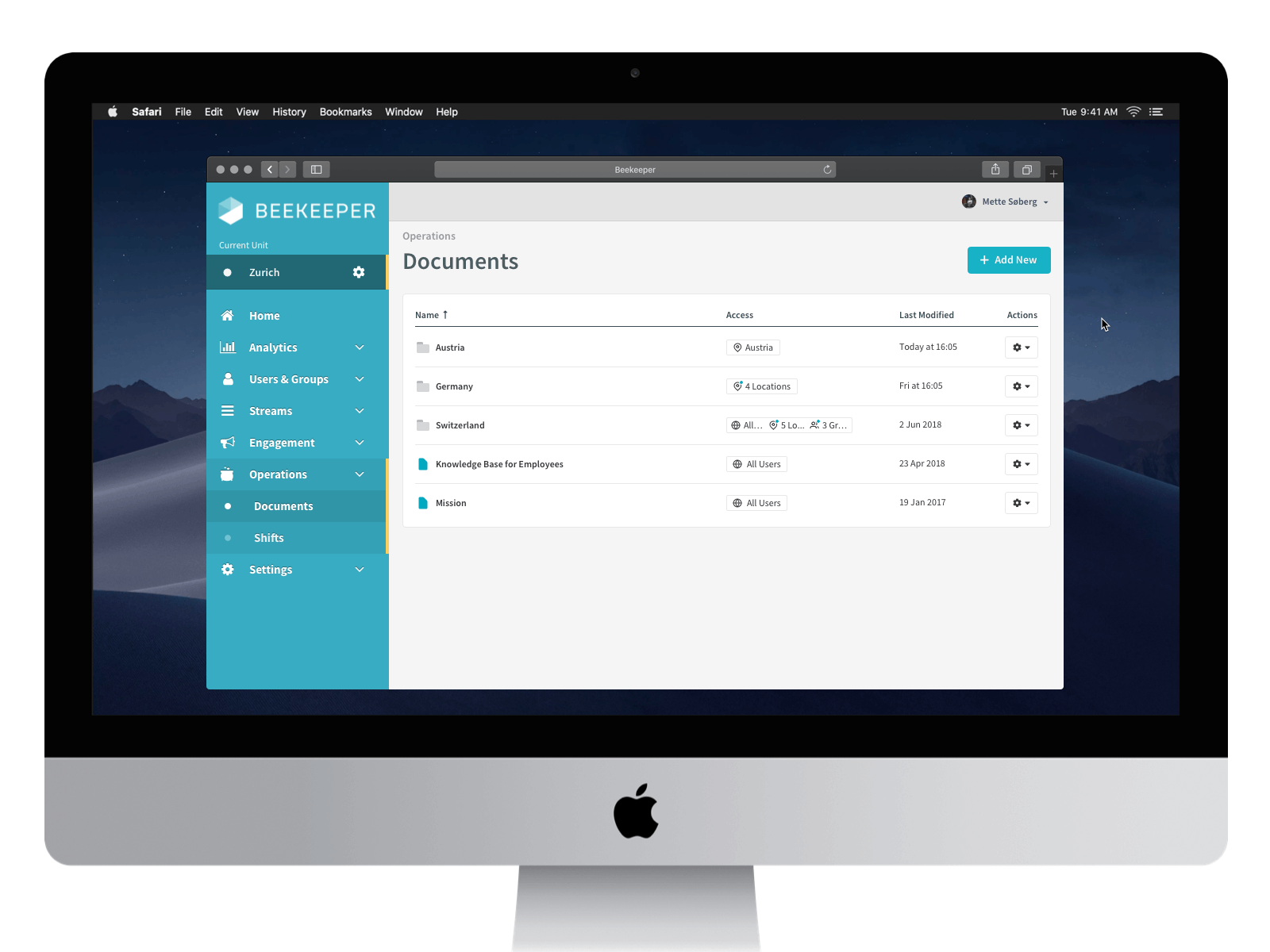 Im Wesentlichen ermöglicht die Funktion „Dokumente“ den Administratoren auf Beekeeper das Teilen von wichtigen Dokumenten mit bestimmten Personengruppen. Zugriffs- und Bearbeitungsrechte können innerhalb einer einfachen Ordnerstruktur nach Teams, Abteilungen oder Standorten segmentiert werden. Ihre Teams können dann unter dem neuen operativen Bereich der Registerkarte “Mehr” in ihrer Beekeeper-App auf Dokumente zugreifen.