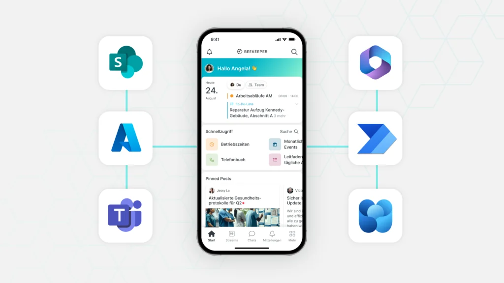 Vernetzen Sie operative Teams und Angestellte im Büro mit Beekeeper-Integrationen für MS Teams, SharePoint, Azure/Entra und Power Automate. Optimieren Sie die Kommunikation, Benutzerverwaltung und den Dokumentenzugriff.