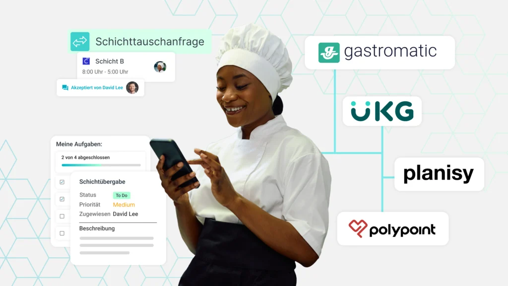 Planen Sie einfacher mit UKG, Gastromatic, Polypoint oder unserem Excel-Add-in. Führungskräfte erstellen Schichten und Mitarbeitende erhalten Echtzeit-Benachrichtigungen direkt in der Beekeeper-App.